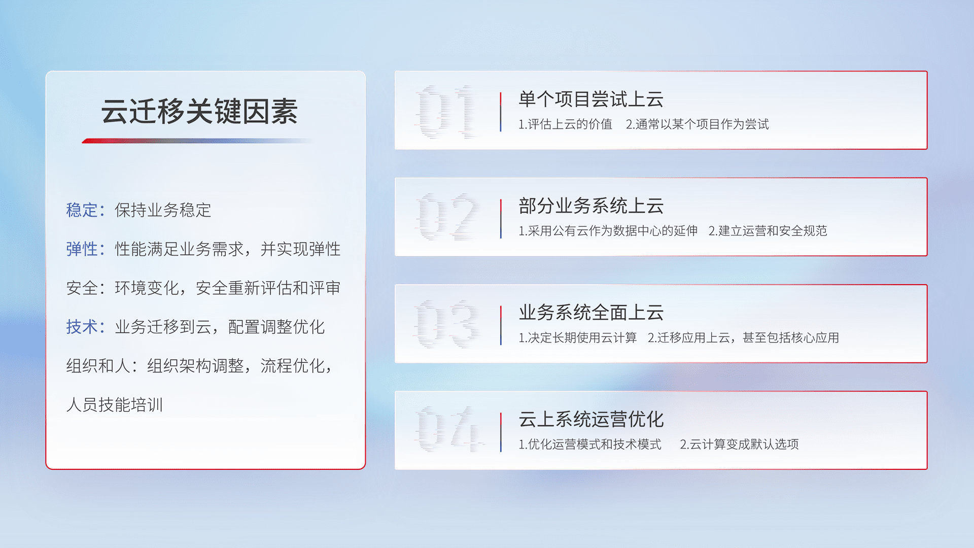 结合实际业务,,,从规划设计、、、云平台选型、、云原生改造、、、数据迁移、、、、集成交付,,,迁移全过程为客户识别最佳上云路径,,做好风险识别管理,,设计网络架构、、、、身份权限、、安全审计合规、、、操作审计、、日志审计、、、监控告警策略、、多站点容灾设计等,,,对云上基础设施进行整体规划,,,提升IT治理水平,,以满足弹性、、高可用、、、、高性能的需求。。。。